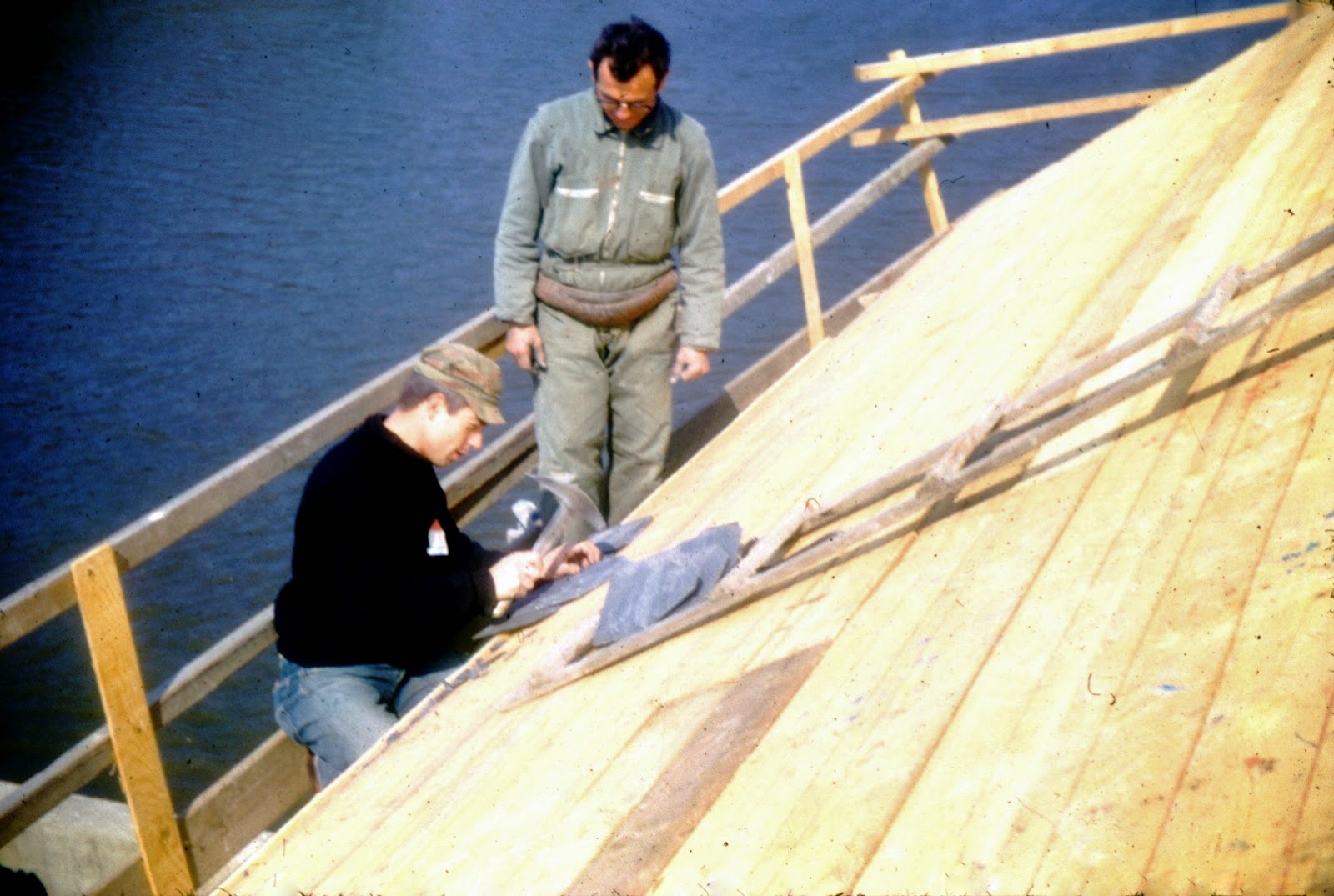 Pose de la première ardoise par Jean-Yves Connen sur la toiture du moulin en avril 68.